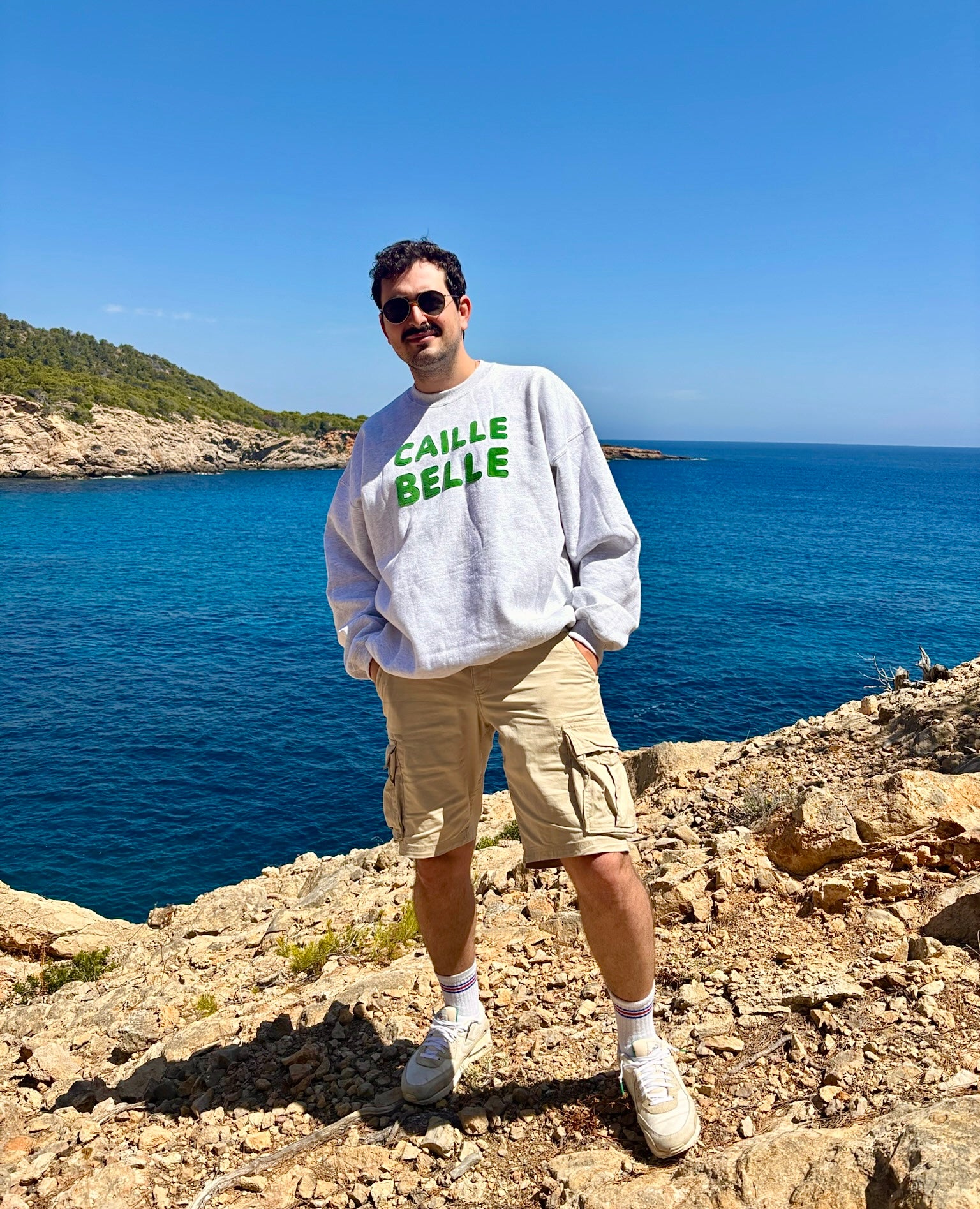 Sweat CAILLE BELLE couleur gris avec écriture verte. À porter oversize en sortie de plage ou pour les hivers cocons.